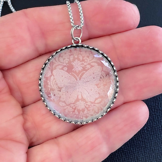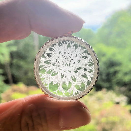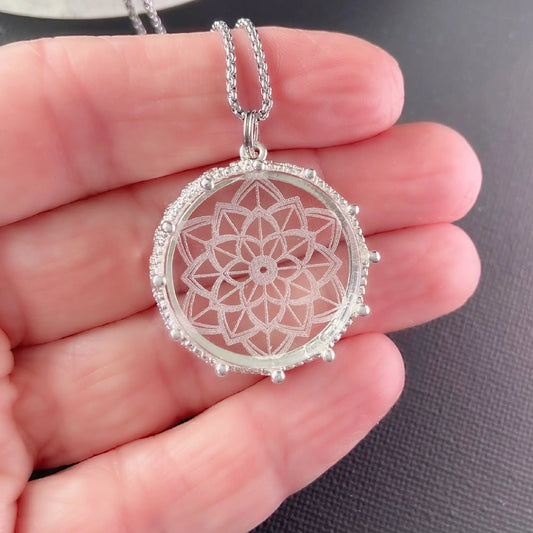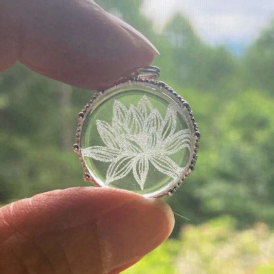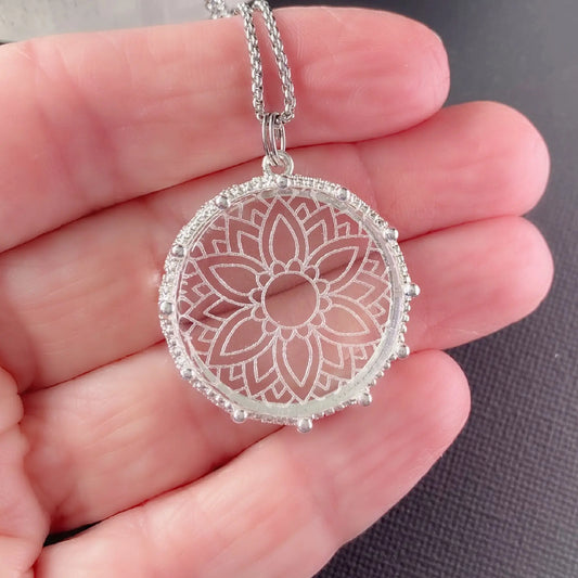 Handcrafted jewelry made from clear glass etched with mandalas, flowers, and nature themes. Includes necklaces, rings, and bracelets.