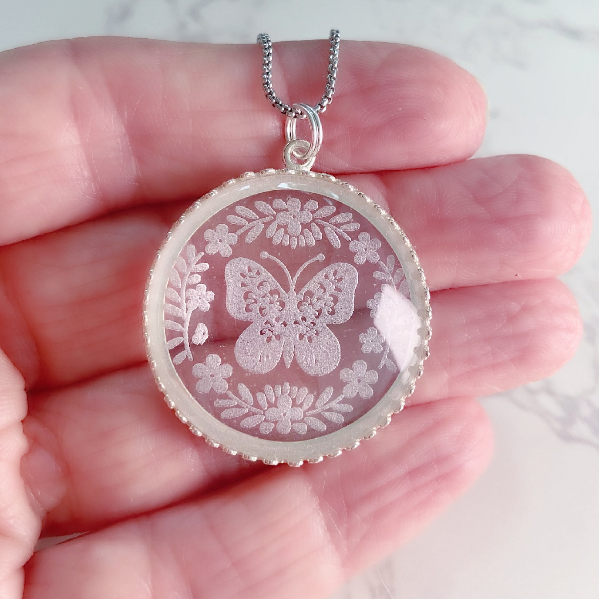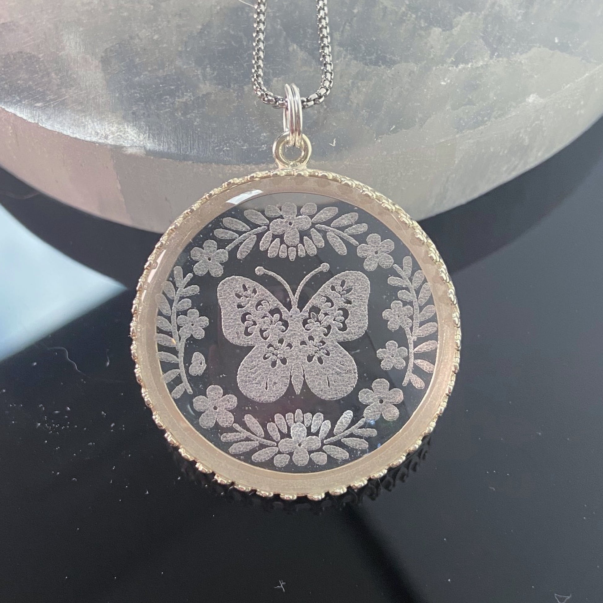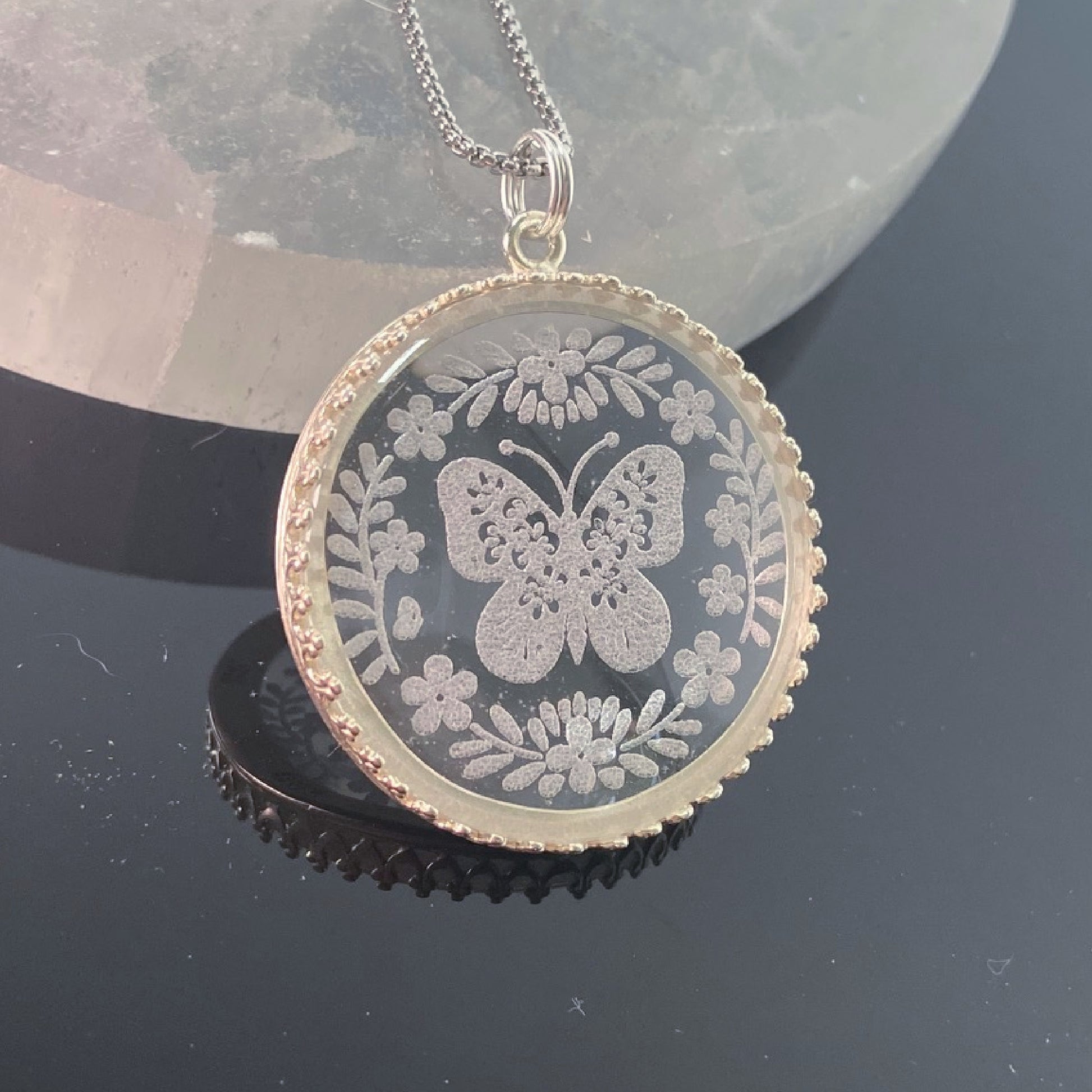 A beautifully detailed butterfly is etched onto crystal clear glass and set into an intricate silver bezel. This ethereal necklace is suitable for casual and elegant styles.