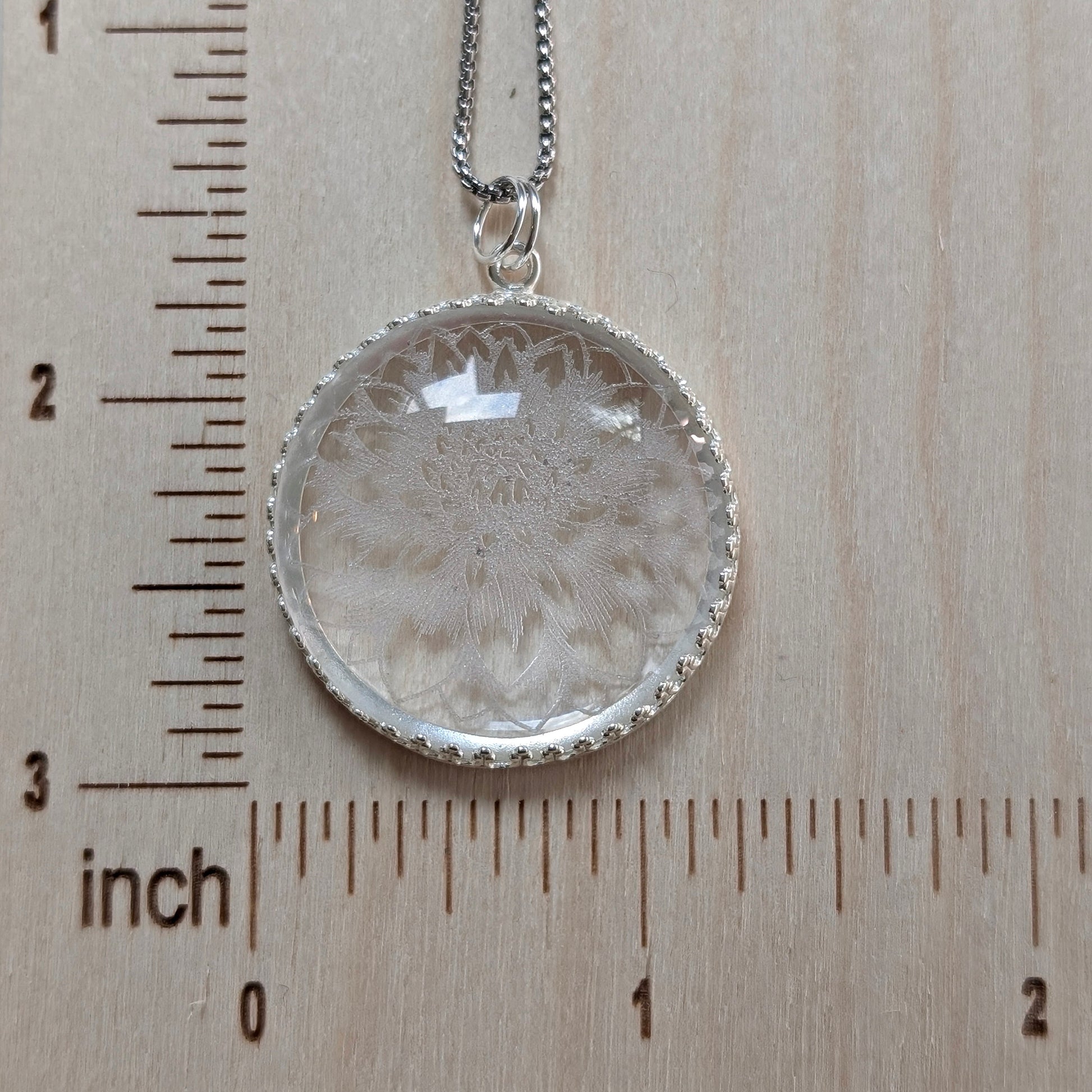 A detailed dahlia flower design is etched onto crystal clear glass and set into an intricate silver bezel. This ethereal necklace is suitable for casual and elegant styles.