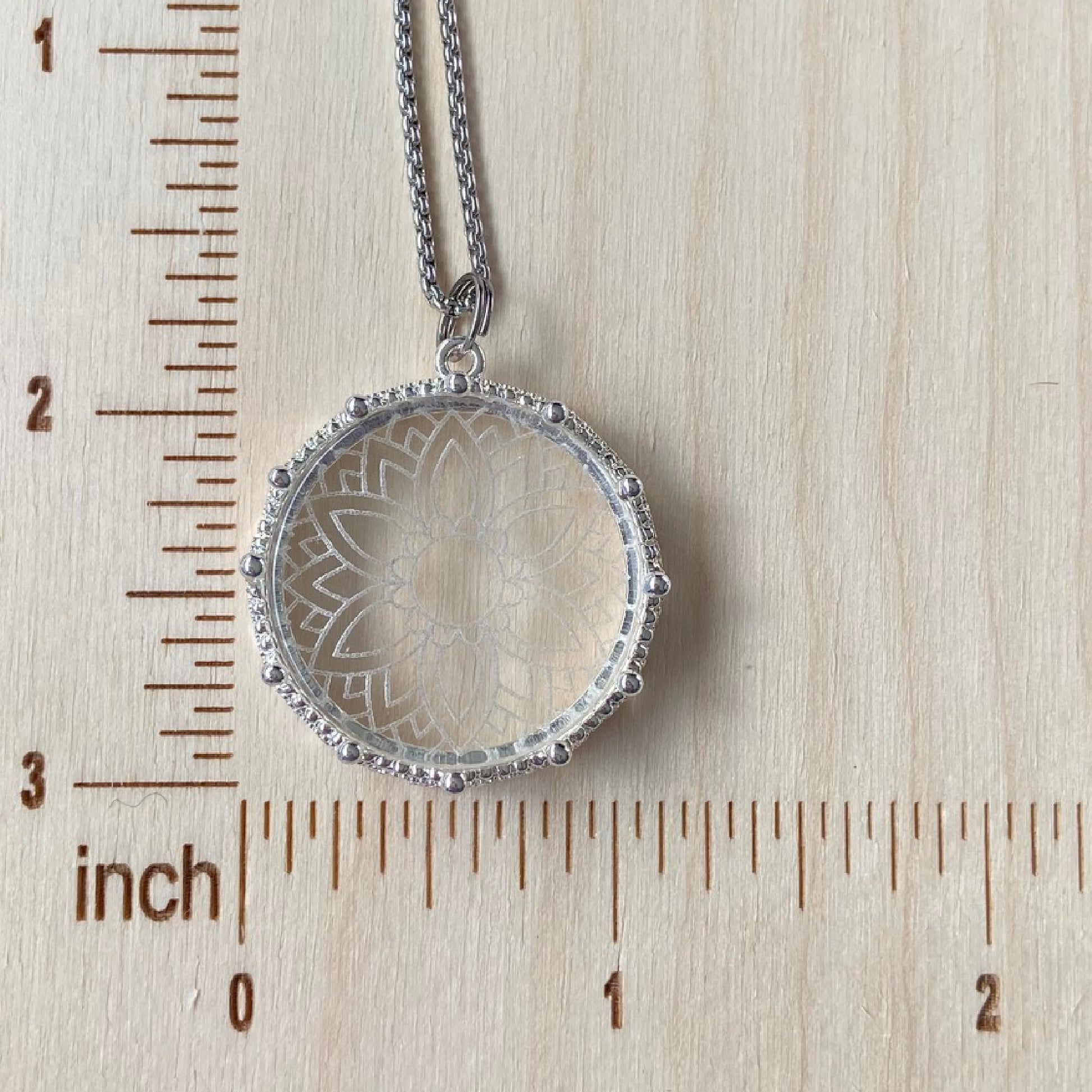 A delicate mandala design is etched onto crystal clear glass and set into an intricate silver bezel. This ethereal necklace is suitable for casual and elegant styles.
