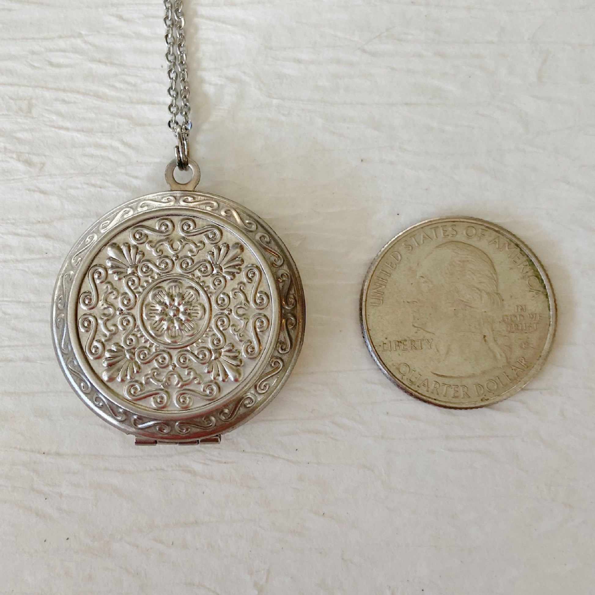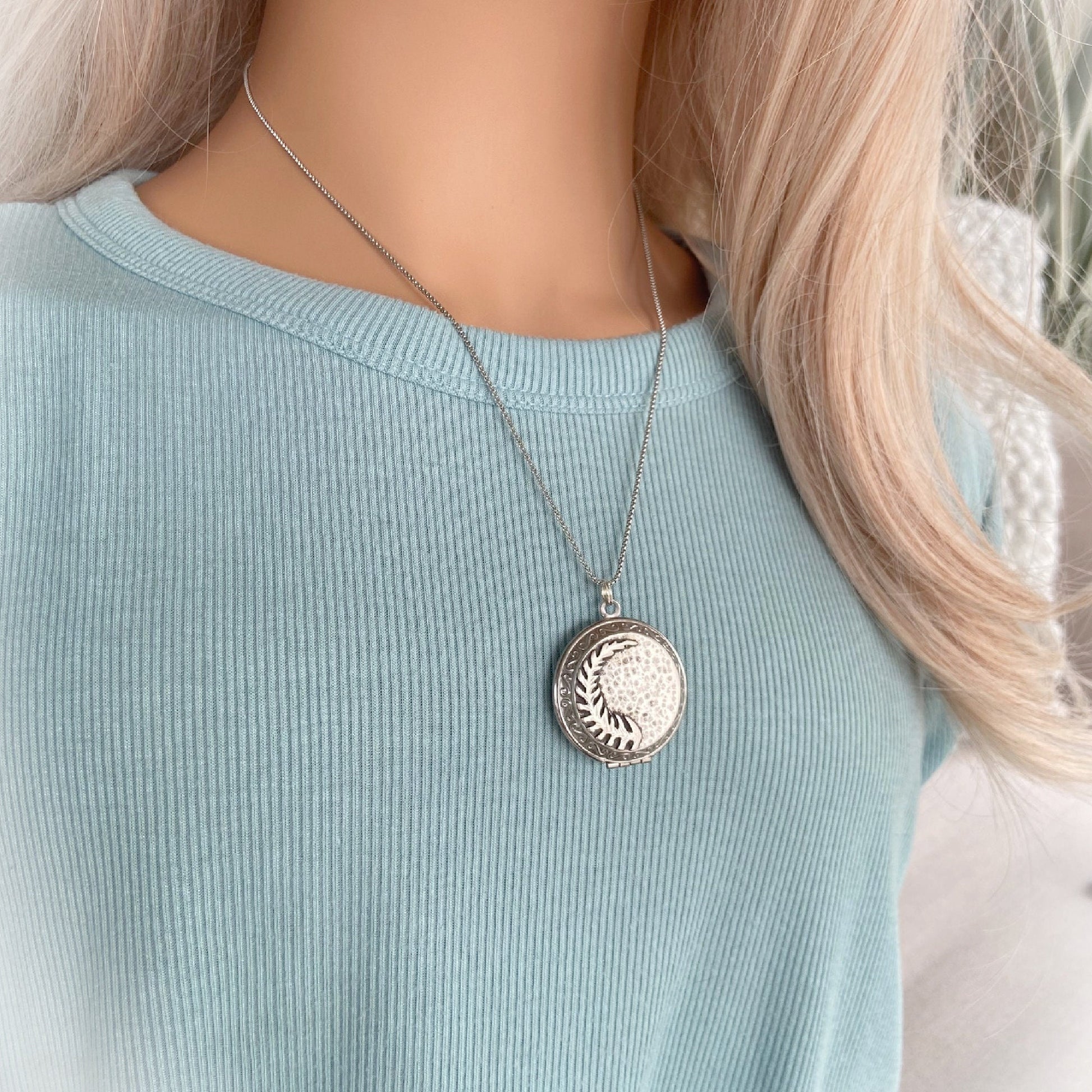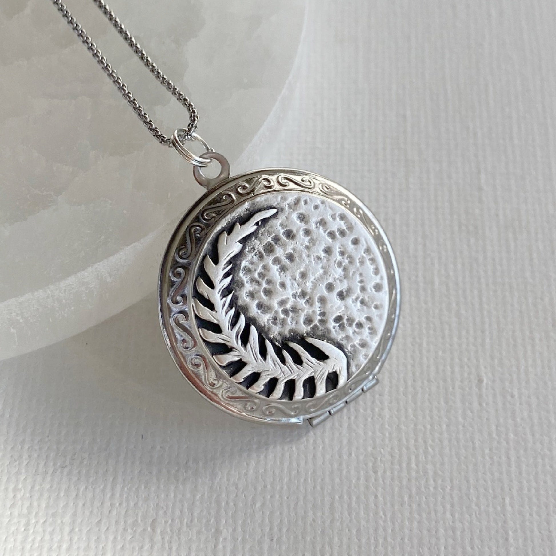 A delicate fern leaf is the focus of this lovely medium size silver photo locket. Timeless and classic, this beautiful embossed silver locket will become a special addition to your jewelry collection. The locket is 30mm in diameter (a little larger than a quarter) and opens for a secret place to keep pictures, messages, or whatever you like.