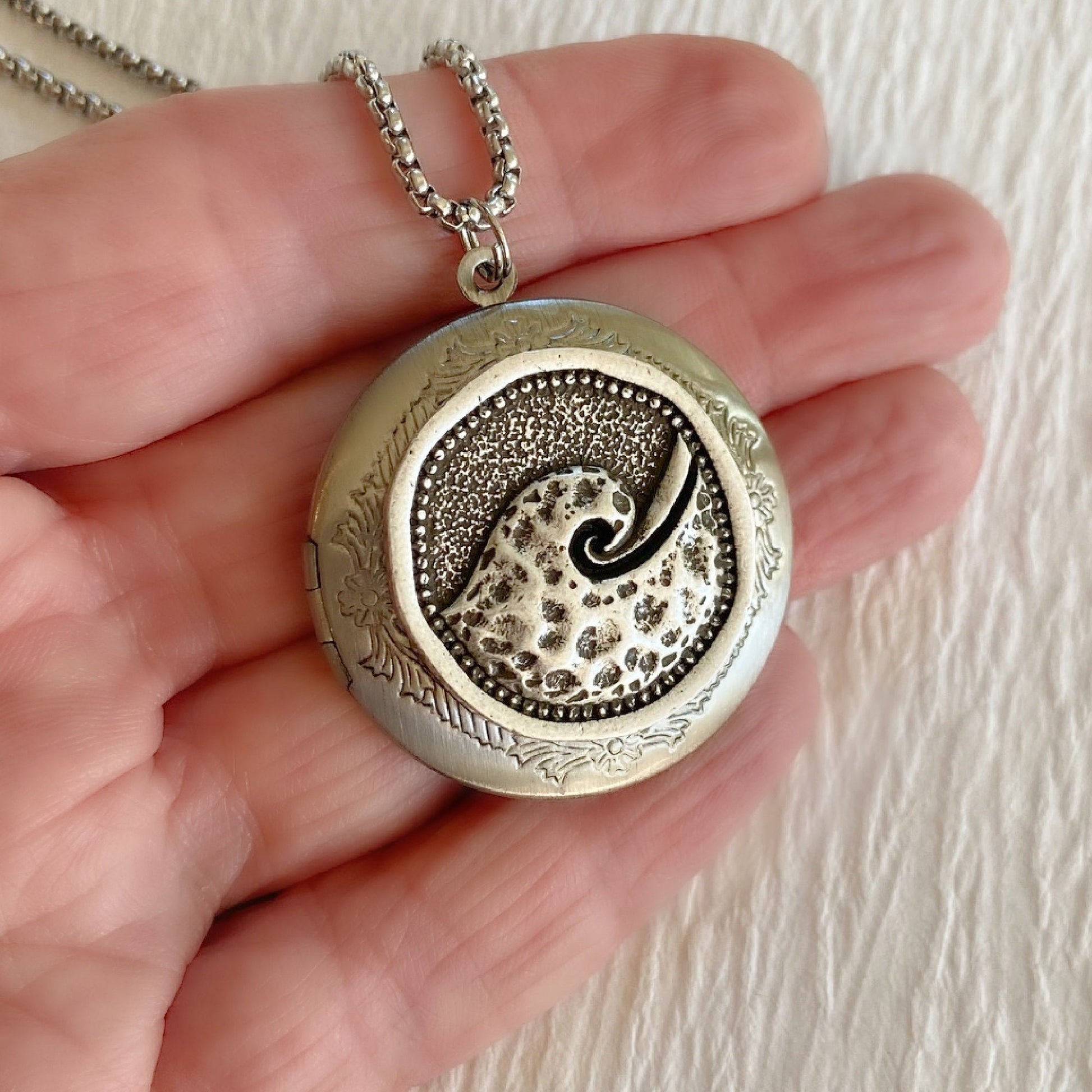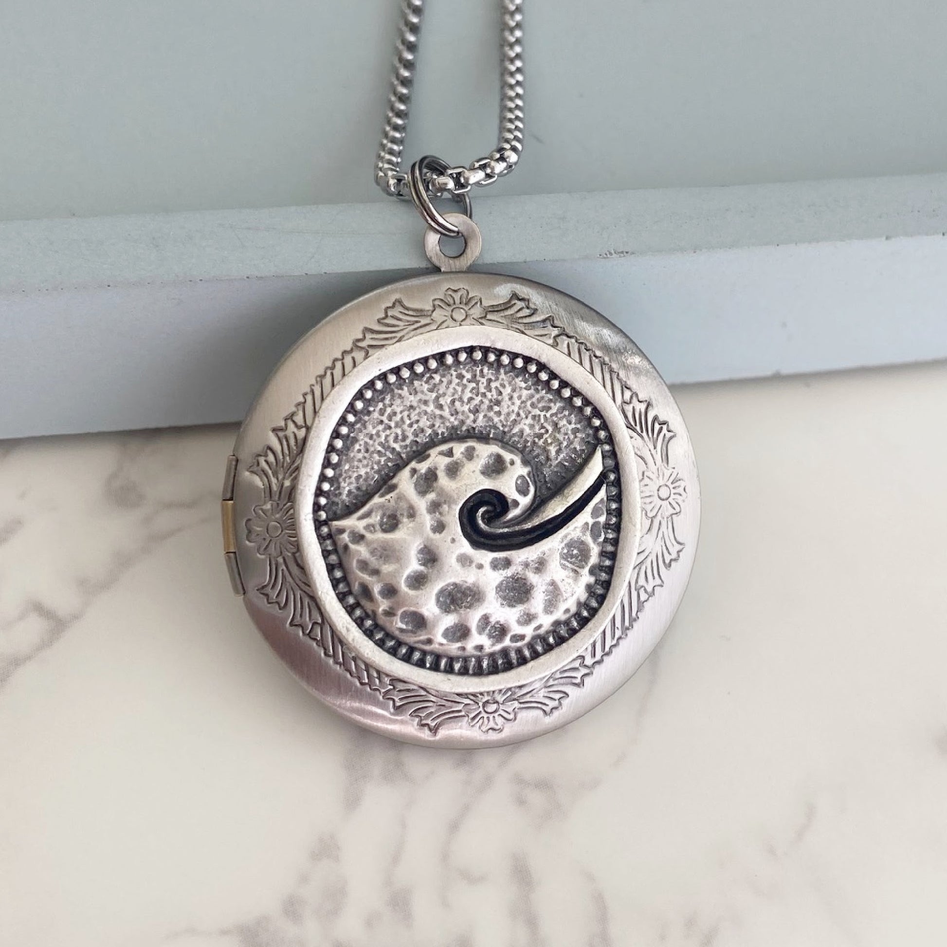 This handmade Silver Ocean Wave Locket necklace features a swelling ocean wave--a thoughtful gift for a swimmer or beach lover. It will become a wonderful addition to any jewelry collection. The locket is 32mm in diameter, silver plated brass and opens for a secret place to keep pictures, messages, or whatever you like.