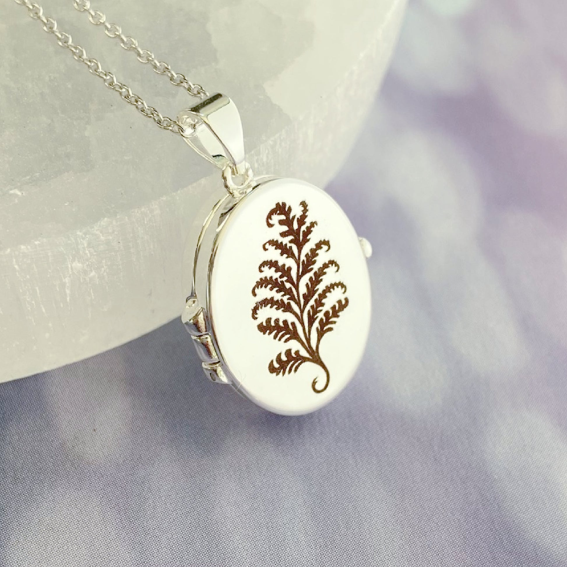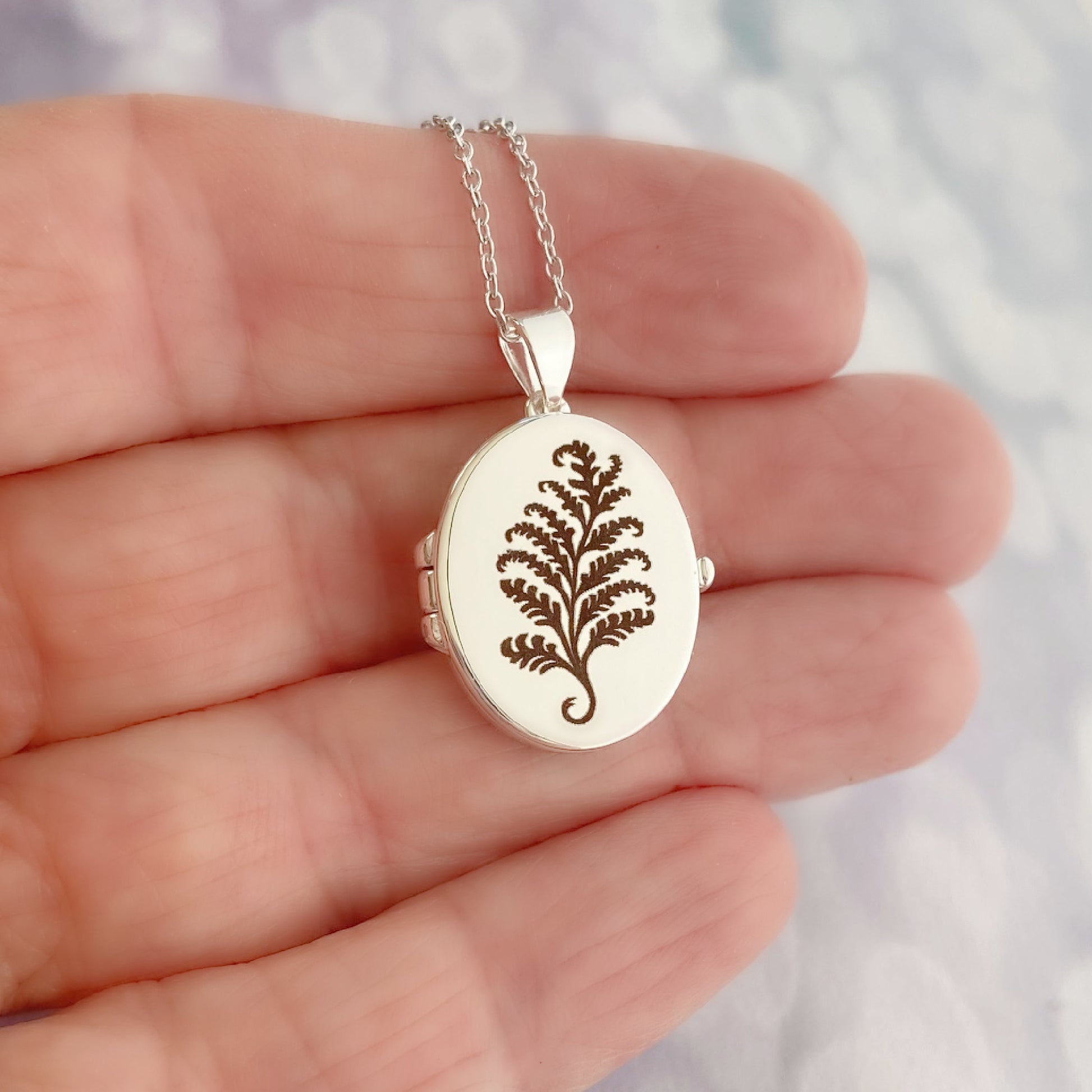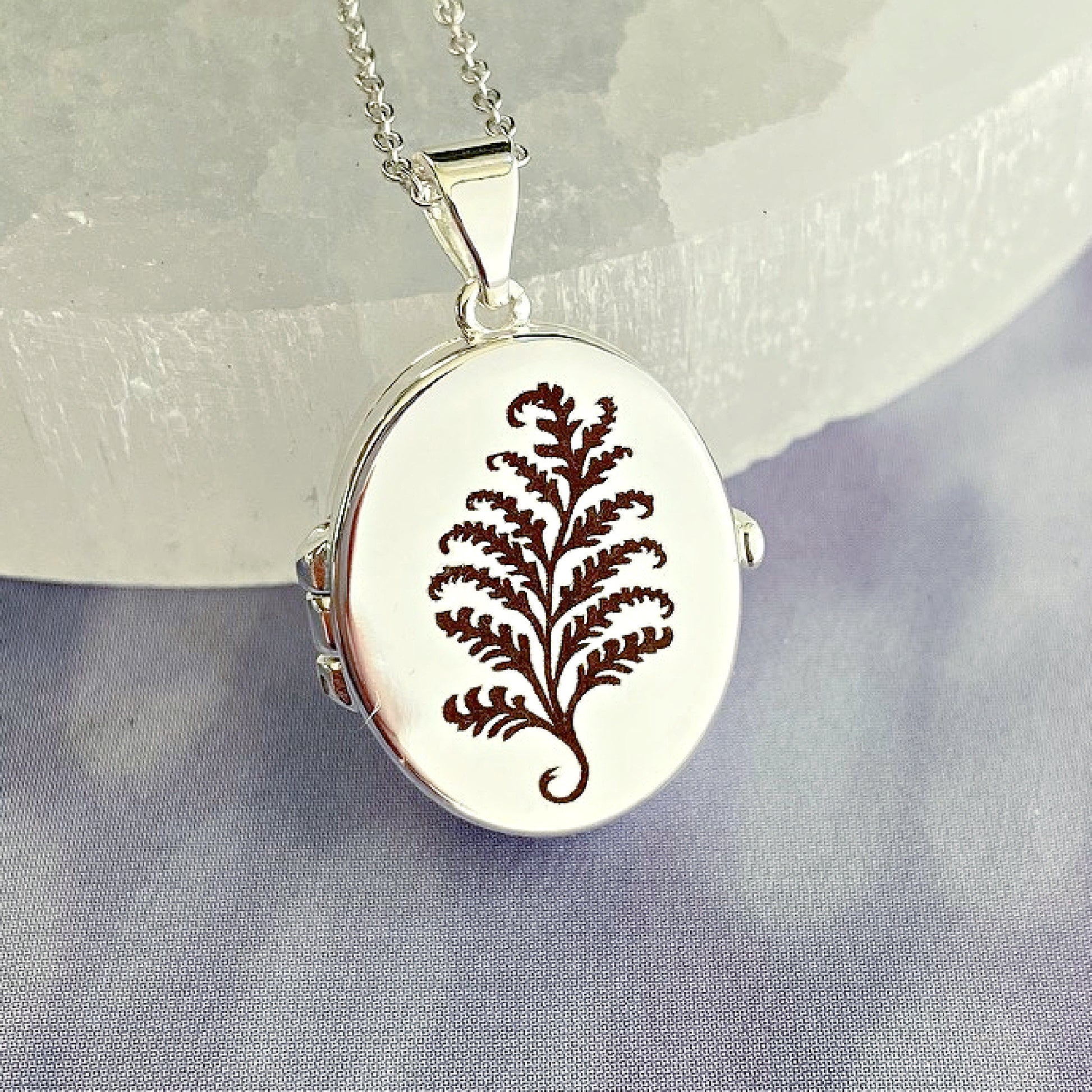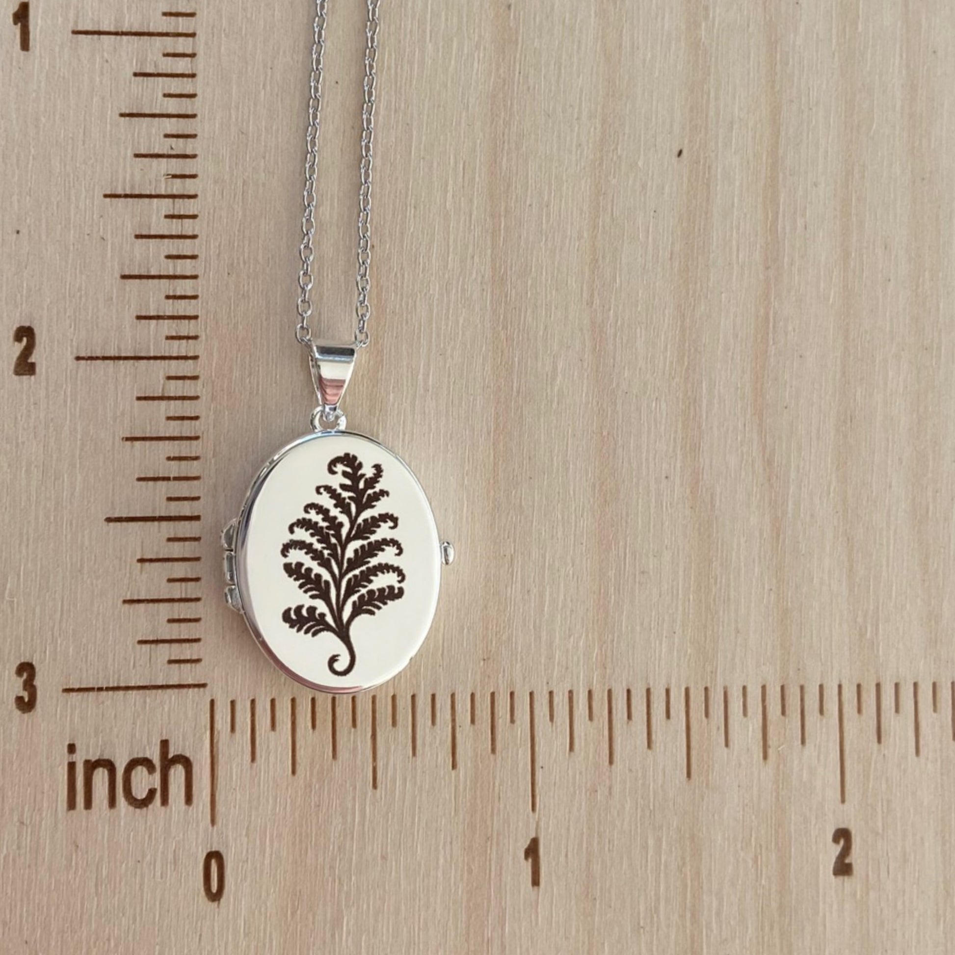 Timeless and classic, this lovely engraved oval locket will become a special addition to your jewelry collection. This one has a beautifully detailed fern frond on the front and a plain back.