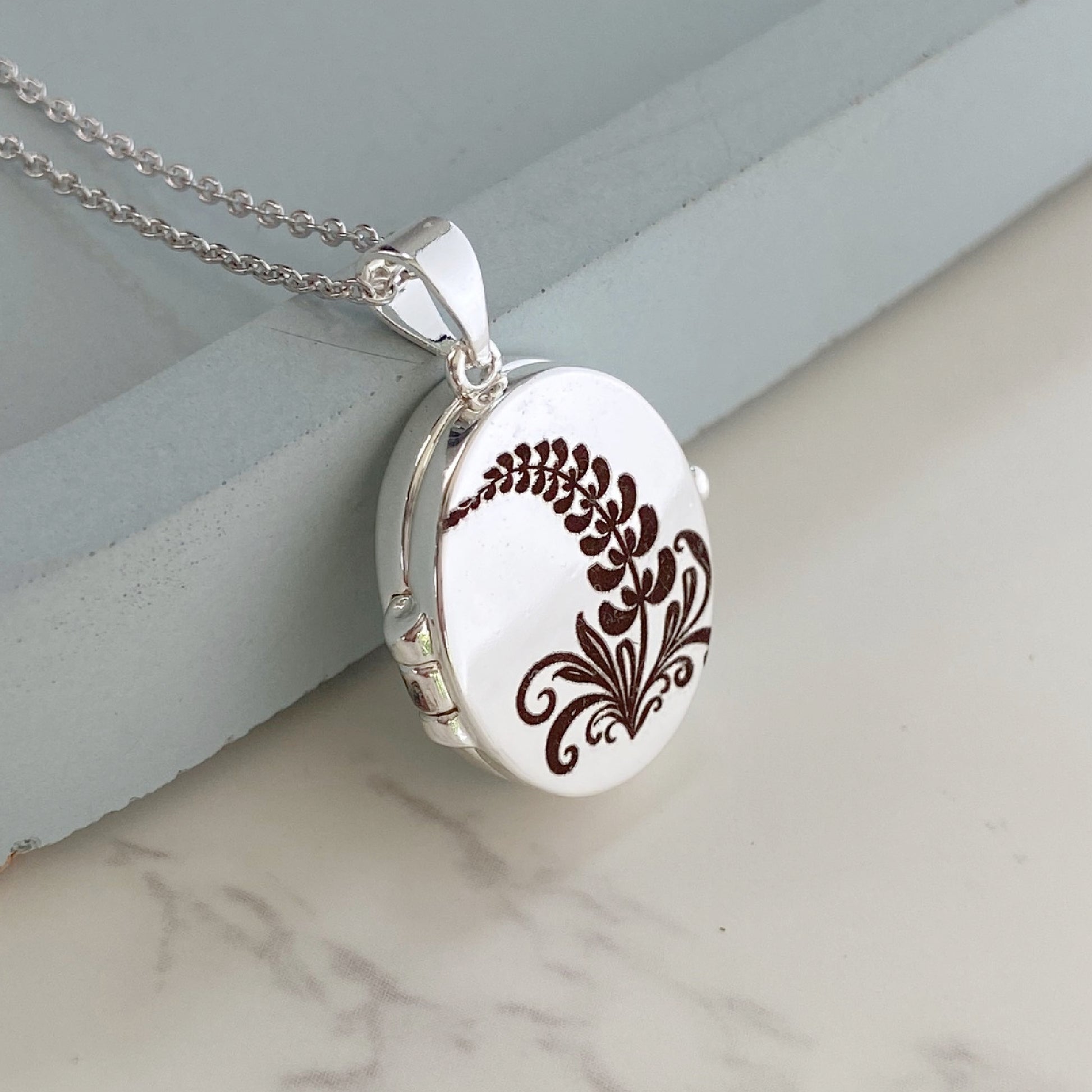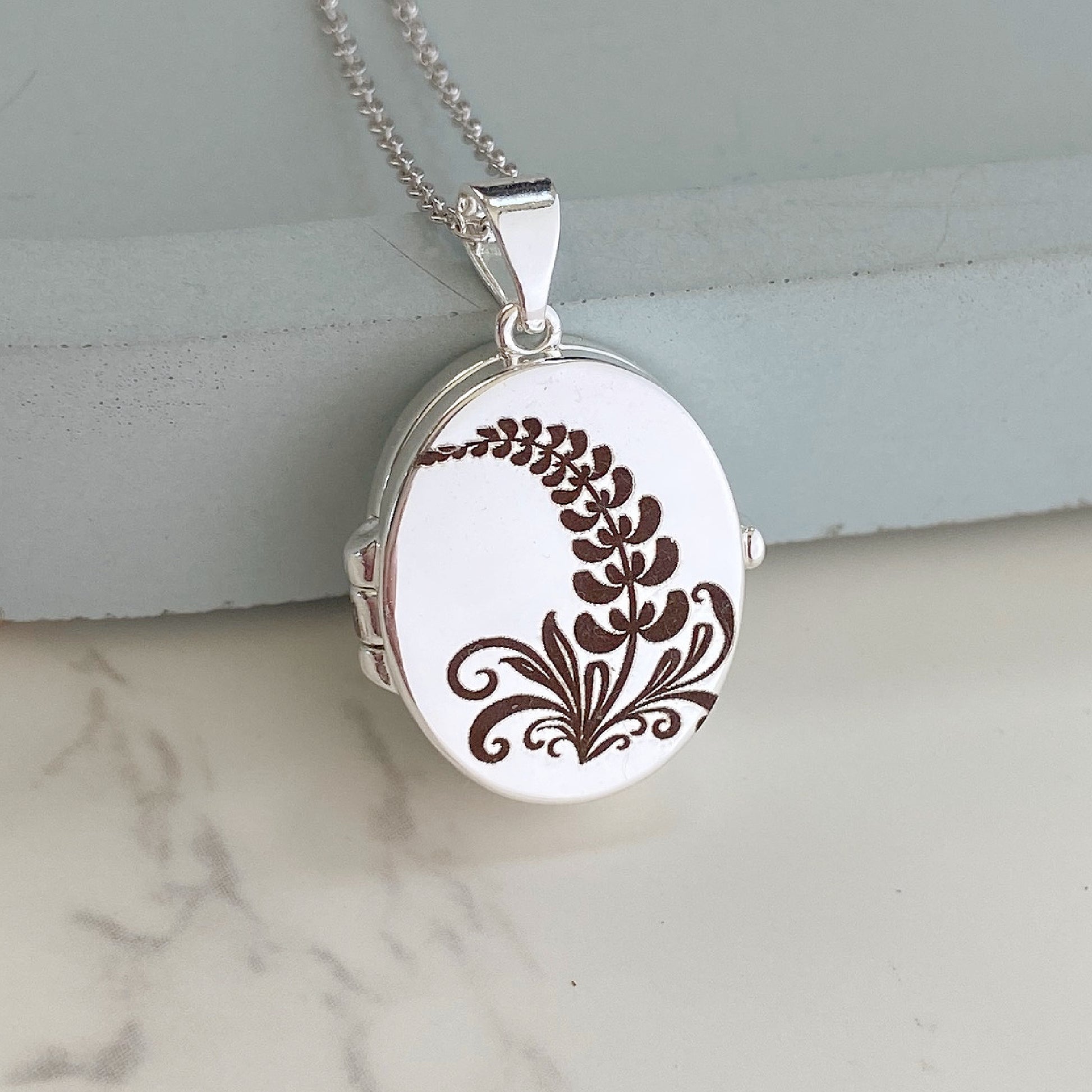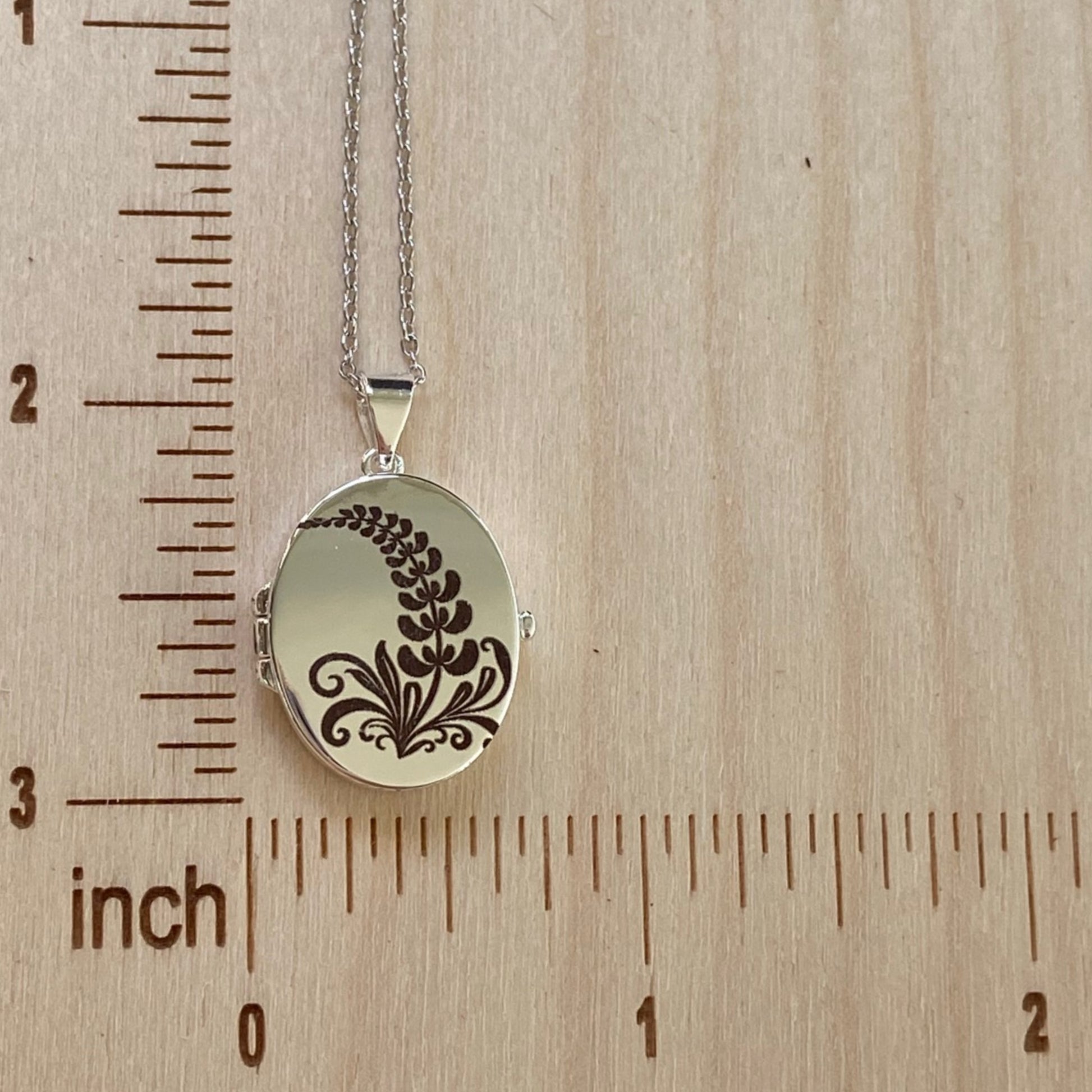 Timeless and classic, this lovely engraved oval locket will become a special addition to your jewelry collection. This one has delicate Larkspur flower on the front and a plain back.
